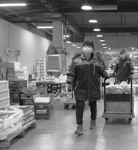 ①在哈尔滨市松北区润恒国际食品交易中心蔬菜区,工作人员在搬运货品。谢剑飞/摄