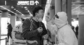 ②在合肥站出站大厅,防疫工作人员为到达旅客采集核酸样本。杜宇/摄