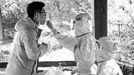 ③浙江大学医学院附属邵逸夫医院支援队的医护人员在浦东昌里小区为居民做核酸采样。蒋爱山/摄