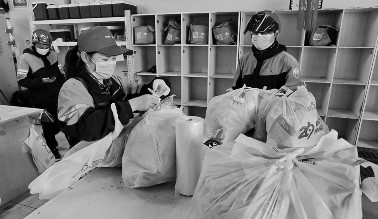 ④在上海市金山区山阳镇的叮咚买菜站点,工作人员在准备为居民配送订单。庄毅/摄