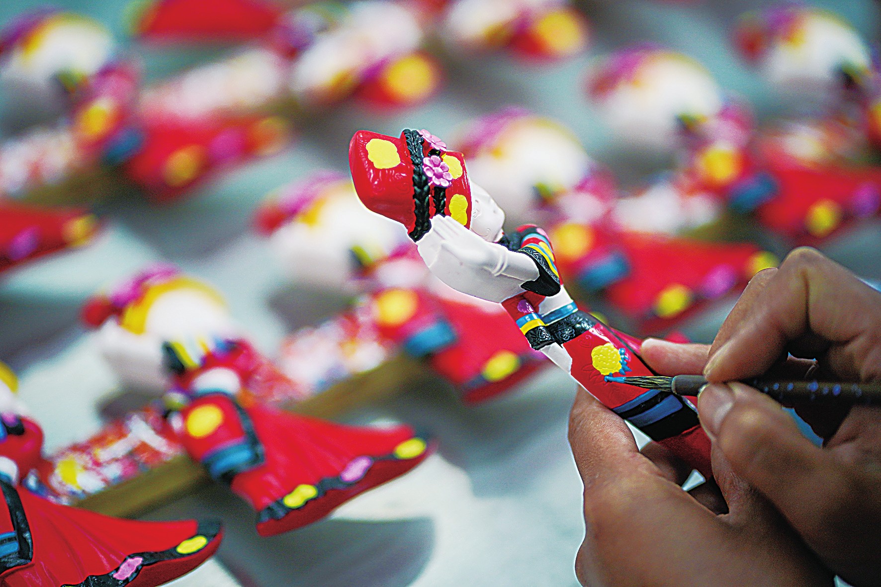 云南省文山壮族苗族自治州西畴县瓦厂村的彩绘文创产品独具特色,深受市场欢迎。近年来,乡村小作坊逐步发展成拥有民俗文化、卡通创意等七大系列、一百多款产品的特色文化创意工场,产品远销省内外。图为云南省文山壮族苗族自治州西畴县瓦厂村村民在制作彩绘文创产品。