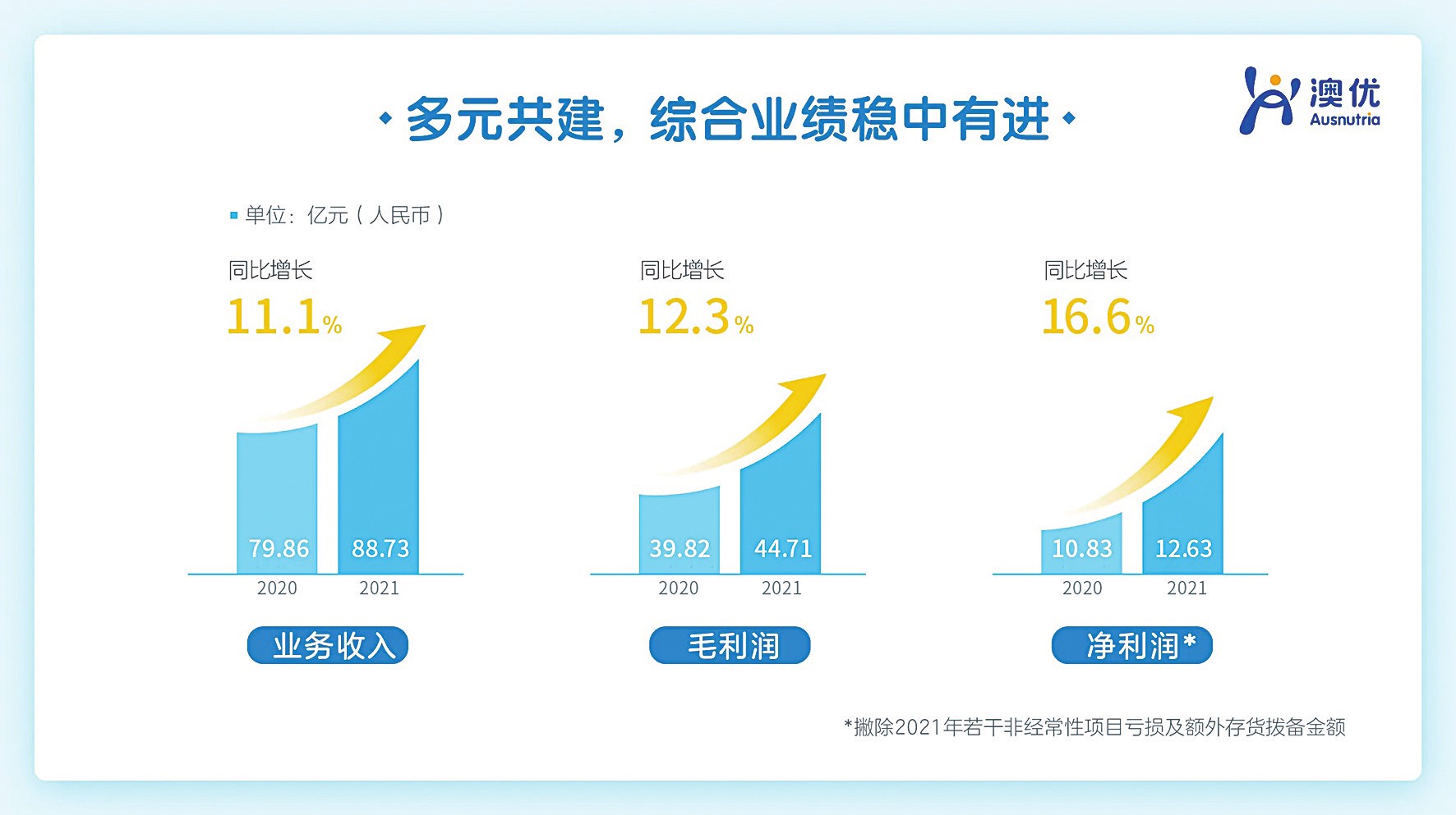 日前,澳优乳业股份有限公司(以下简称“澳优”)正式发布2021年全年业绩公告。 公告显示,2021年澳优录得收入为88.73亿元,较2020年同期79.86亿元同比增长11.1%;毛利为44.71亿元,较2020年同比增长12.3%;截至2021年12月31日,公司净现金结余为12.14亿元,继续维持稳健的现金转换及流动性水平。 2021年是中国婴配奶粉产业深度整合变革之年。在全球疫情冲击及国内人口出生率持续走低的挑战中,澳优作为践行全球化发展的乳品及营养品企业,面临国内外诸多不利因素,依旧实现了公司核心业务稳定增长、管理水平持续提高。 作为公司最核心的业务之一,2021年澳优自有品牌配方奶粉业务实现稳健增长,整体销售额为77.62亿元,较2020年同期69.26亿元同比增长12.1%。根据行业相关数据,澳优在中国大陆婴幼儿配方奶粉行业线下销售市场占有率进一步提升至约6.9%,位列第五。 公告期内,澳优自有品牌配方牛奶粉录得销售额为44.14亿元,较2020年同期38.20亿元同比增长15.5%;自有品牌配方羊奶粉录得销售额为33.48亿元,较2020年同期31.06亿元同比增长7.8%,中国及海外市场分别实现销售额为31.30亿元和2.18亿元,分别占比约93.5%和6.5%。 澳优三大婴幼儿配方奶粉核心品牌:佳贝艾特(中国)、海普诺凯1897及能立多均获得双位数增长,跑赢整体行业表现。据尼尔森(Nielsen)市场研究报告显示,公司旗下唯一羊奶粉品牌——佳贝艾特销量自2018年以来已连续4年占中国婴幼儿配方羊奶粉总进口量超60%,行业领头羊地位持续巩固;旗下专注于超高端市场的海普诺凯生物(含海普诺凯1897系列、Neolac悠蓝等品牌)于2021年实现销售额为31.82亿元,较2020年同比增长17.9%,其中海普诺凯1897荷致录得同比增长为22.0%;经过重组整合后的能立多于公告期内实现销售额为10.19亿元,较2020年同比增长23.3%,其中能立多G4录得同比增长49.8%。 澳优自主科研领先行业,创新转化成效明显。2021年,澳优坚持自主科研发展,稳步推进配方奶粉和营养健康服务相关业务,累计投入研发费用为1.93亿元,研发成本占营收比例约2.2%,研发占比位居行业前列。 随着中国婴配奶粉行业新国标和二次配方注册制的到来,公司婴配注册稳步推进,已提交多款新老配方注册材料。值得一提的是,佳贝艾特向扬儿童成长营养配方羊奶粉也于公告发布期前面市,重磅加码儿童奶粉蓝海市场。 营运水平不断提升的同时,澳优持续加强供应链建设,确保公司产品质量。2021年,澳优澳洲ADP工厂益生菌产品获注册通过;荷兰Pluto和Hector工厂获批延续注册。澳优在全球工厂推行全球一流制造体系,进一步强化了公司国内外供应链的协同及效率提升,大幅缩减了海外产品放行周期。 与此同时,澳优引进实力产业股东,迎来战略发展新阶段。2021年,澳优引进伊利集团成为公司单一最大股东。作为2021年中国乳业企业之间规模最大的一笔投资并购,伊利集团战略入股公司备受各方关注,有关交易已于2022年1月18日完成,并通过全面要约收购于2022年3月17日成为澳优控股股东。澳优将继续坚持企业愿景不变、使命不变、核心战略不变、核心管理层及团队不变,继续拥抱和赋能渠道发展,与伊利联手合作,力争在全球市场实现1+1>2的战略协同,推动中国乳业乃至全球健康食品行业的发展。 澳优同时在品牌、团队建设、管理等多维发力,提升企业营运水平。公告期内,澳优携旗下多款新品及全新IP形象连续第四届亮相进博会,旗下各子品牌开展了多项卓有成效的品牌活动,让公司及各品牌的知名度、美誉度进一步提升。 澳优董事长颜卫彬表示,2022年是澳优“黄金十年”发展战略第二阶段的收官之年,尽管当前行业面临种种挑战,但我们对行业前景仍然保持乐观态度。未来澳优将继续以坚定不移的决心,做大做强核心业务与品牌。