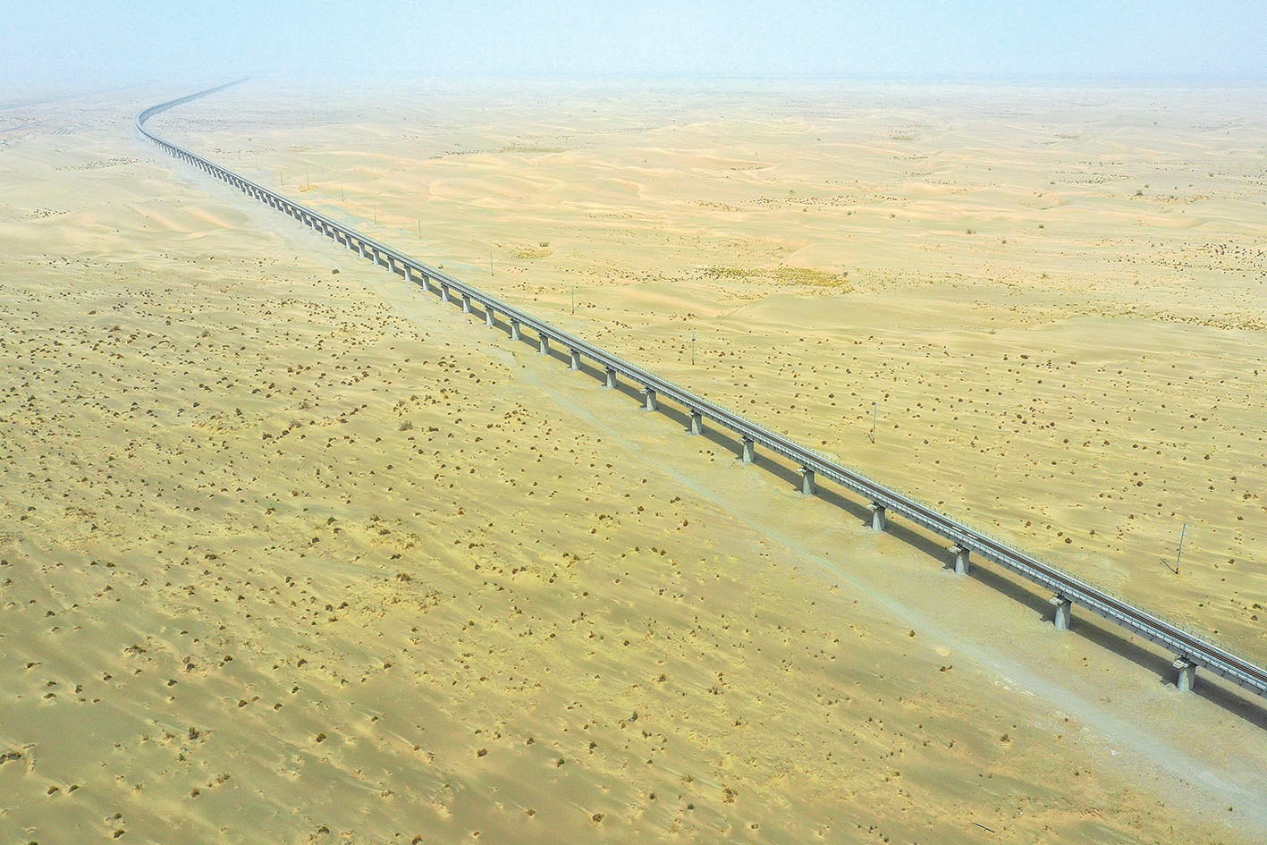6月16日,满载乘客的5818次列车从新疆和田站驶出,和若铁路开通运营。和若铁路与南疆铁路、格库铁路构成一条全长2712公里的环塔克拉玛干沙漠铁路线。自此,世界首条环沙漠铁路线建成。和若铁路的建成通车结束了且末、民丰等5个县和新疆生产建设兵团3个团场不通火车的历史。图①为5月19日拍摄的和若铁路依木拉克特大桥;图②为当日在新疆和田火车站,乘客有序登上和若铁路首趟列车。