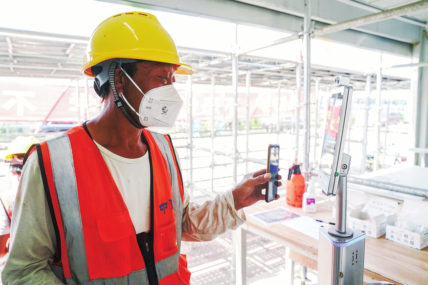 当前,上海在抓好疫情防控工作的基础上,全力以赴保生产、稳运行,全力拉满重点行业、重点企业生产“进度条”。图为近日,某上海公司工人在进入工地前扫“数字哨兵”。