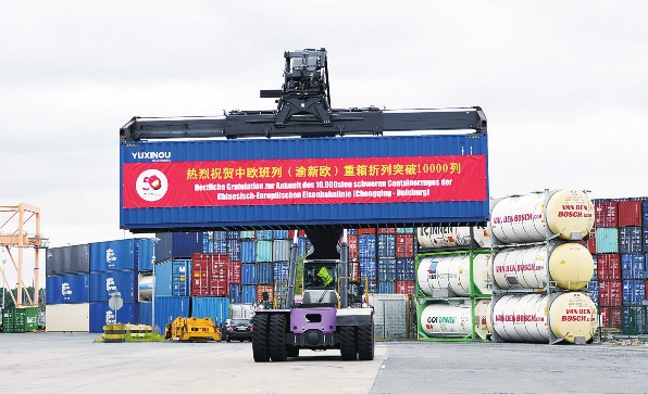 中国首条中欧班列线路中欧班列(重庆)第10000列重箱折列接车仪式11日在杜伊斯堡市DIT场站举行。图为在德国杜伊斯堡市拍摄的中欧班列(重庆)第10000列重箱折列接车仪式现场。