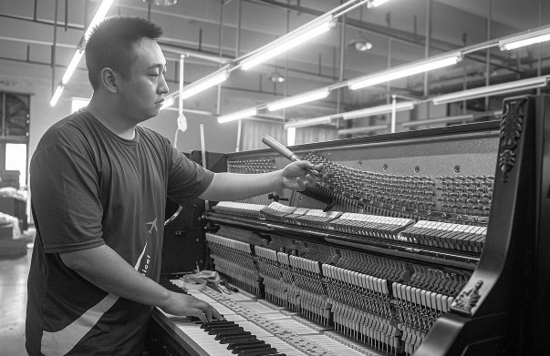 钢琴制造产业是浙江省湖州市德清县洛舍镇的特色产业之一。近年来,洛舍镇通过建立钢琴众创园、打造钢琴文化特色小镇、推动钢琴与文旅产业融合发展等措施,促进钢琴制造产业转型升级。目前,洛舍镇共有钢琴制造及配件企业100余家,钢琴年产量超5万架。图为调音师在洛舍镇一钢琴制造企业内为钢琴调音。