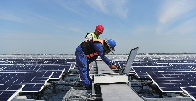 近年来,安徽省阜阳市颍上县古城镇积极推进采煤沉陷区治理工作,将昔日的采煤沉陷区建设成水上光伏电站,既减少占用土地面积,又能生产清洁能源。图为近日,运维人员在颍上县毛圩水上光伏电站进行巡检。