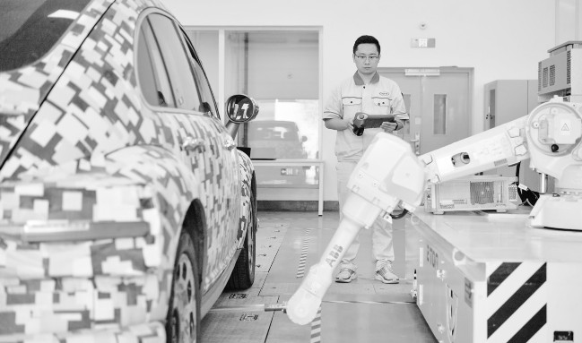 近日,中国汽车技术研究中心有限公司新能源汽车科技创新基地在天津建成启用。该基地共建设11.6万平方米的综合试验楼,配套超过1000台套测试设备,主要围绕燃料电池、动力电池、电驱电控、充电技术、电磁兼容、新能源整车等六大领域,测试能力覆盖新能源乘用车、商用车整车和其他相关部件。图为在中汽中心新能源汽车科技创新基地充电技术部,工作人员操纵设备测试新能源汽车无线充电辅助性能。