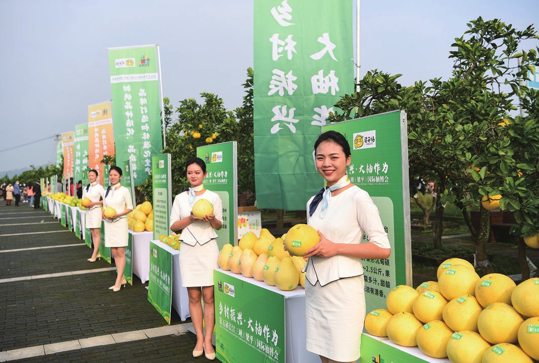 近年来,重庆市梁平区因地制宜,大力发展柚子种植,将梁平柚产业作为全区农业的主导产业之一,开发柚子深加工产品,延长相关产业链,助力乡村振兴。图为在梁平区合兴镇龙滩村,工作人员在柚博会上展示柚子。