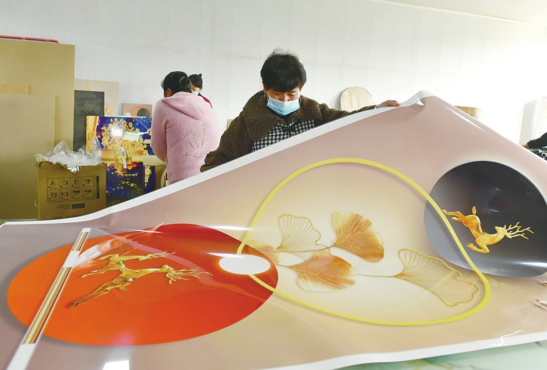 河南省商丘市夏邑县桑堌乡投资建设5G电商园,为农村电商搭建平台,带动农产品深加工、装饰画、移动柜门等产业发展,助推当地农村产业升级、农民增收。图为在夏邑县桑堌乡5G电商园,员工在包装装饰画。苗育才/摄