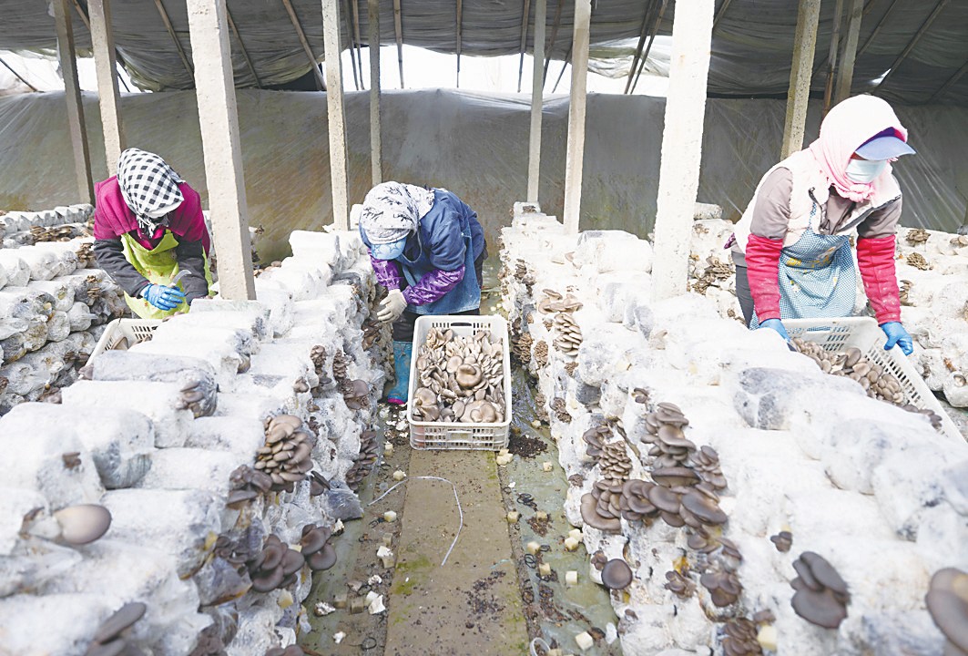 近年来,河北省唐山市丰南区引导农民采取“合作社+基地+农户”的模式,规模化发展特色食用菌种植,促进农民增收,助推乡村振兴。据介绍,目前该区年产平菇、香菇等食用菌4000余吨。图为丰南区东田庄乡大吴庄村的农民在大棚内采摘平菇。