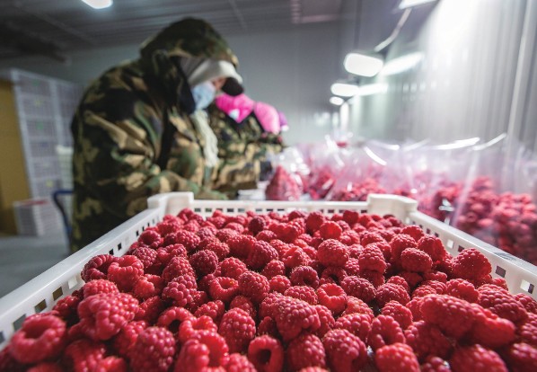 宁夏银川市贺兰县洪广镇欣荣村是一个“十二五”生态移民搬迁安置村,近年来,欣荣村通过“冷库+智能温室+大田”的模式发展鲜食红树莓产业,采用水肥一体化与无土栽培相结合的种植方式,实现鲜食红树莓全年不间断供应,拓宽农民增收渠道,助力乡村振兴。图为在宁夏贺兰县洪广镇欣荣村红树莓种植基地冷库内,农民在分拣红树莓。