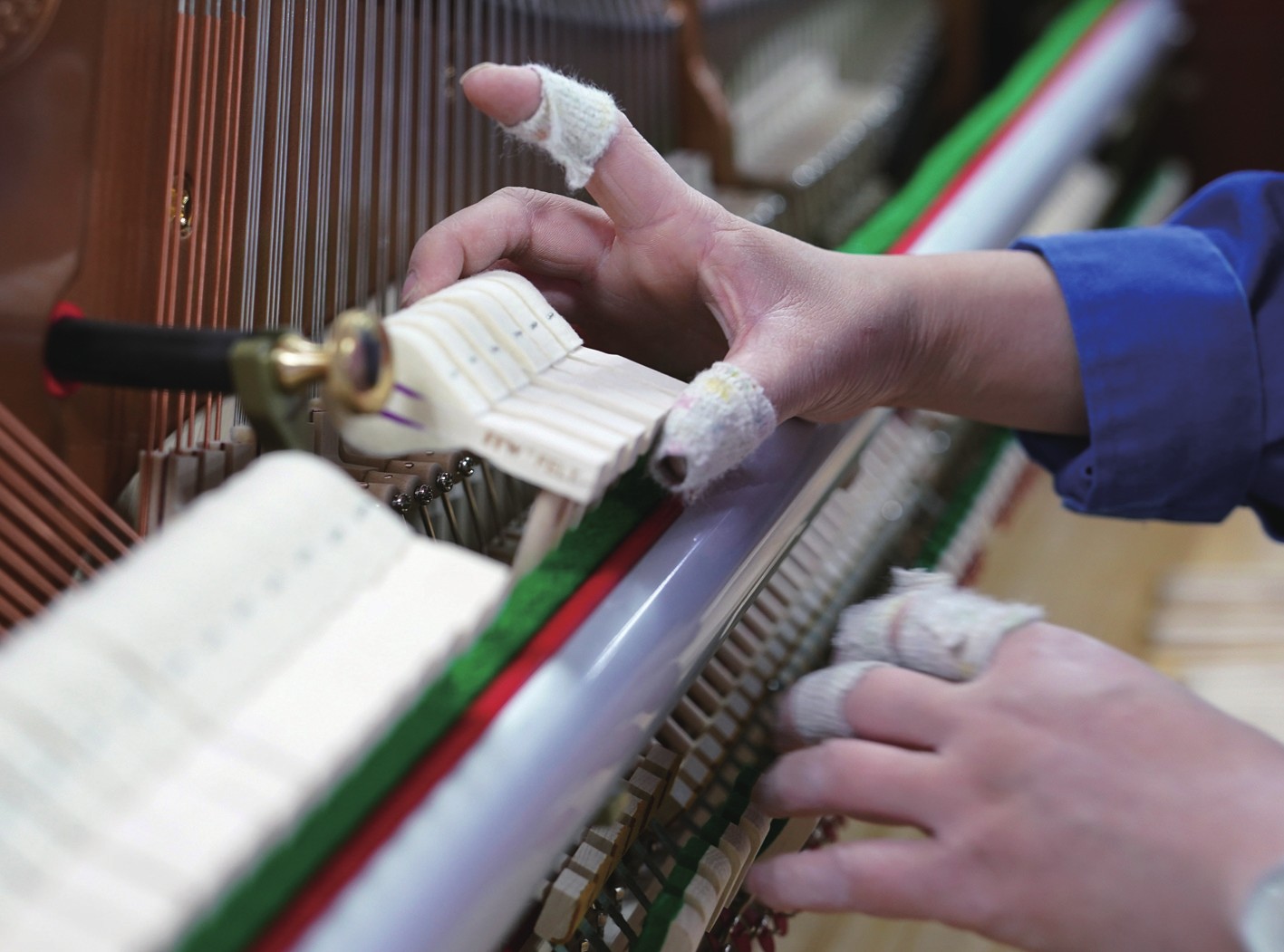 位于浙江省湖州市德清县洛舍镇的钢琴小镇,是长三角地区较大的钢琴生产基地。近年来,面对市场低迷等不利因素,钢琴小镇110多家钢琴制造及配套企业不断提升产业创新能力和竞争力,通过研发新品、线上销售、合资合营、文旅融合等举措,着力开拓海外中高端市场,弹奏起钢琴产业“转型曲”。据介绍,今年1至2月,钢琴小镇出口同比增长约15%,实现稳健开局。图为近日,工人在德清县洛舍镇东衡村一家钢琴制造企业内装配钢琴。
