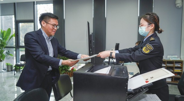 3月30日,江苏省第1000万户个体工商户营业执照从南京市雨花台区市场监管局雨花分局发出。据介绍,今年以来,江苏新登记个体户27.5万户,同比增长5.5%。江苏省个体户数量从2012年底的348.2万户,发展到现在的1000万户,年均增长11.1%,约占全省经营主体总量的69.9%。图为当日在南京市雨花台区市场监管局雨花分局,江苏省第1000万户个体工商户张康(左)领取个体工商户营业执照。