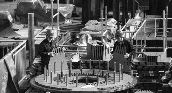 作为我国发电设备制造业的“摇篮”,哈电集团在水电、火电、核电、气电等领域处于全国领军地位。近年来,哈电集团加快推进关键核心技术攻关,不断提高装备制造业发展活力和竞争力,引领推动装备制造业高质量发展。图为在哈电集团哈尔滨电机厂有限责任公司的生产车间,工人在进行生产作业。