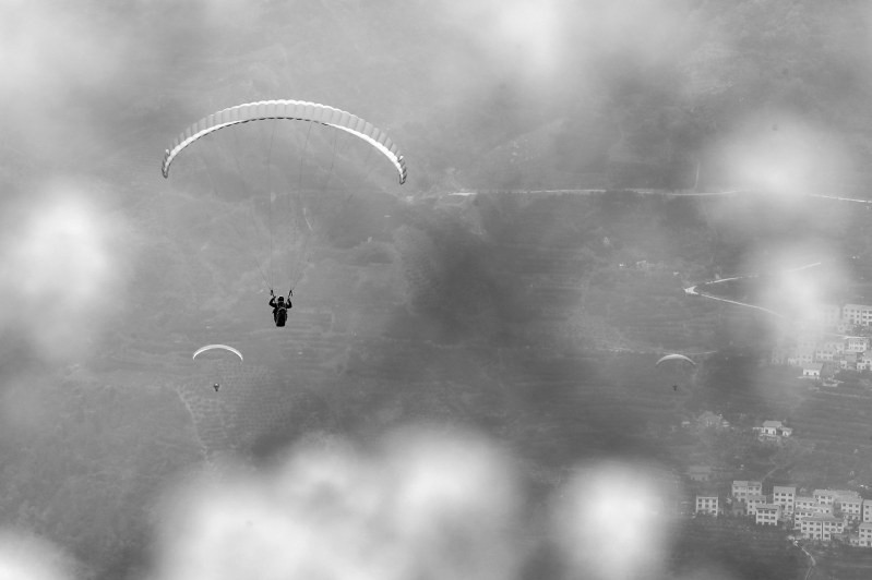 时下,三峡库区湖北省宜昌市秭归县春橙丰收、橙花盛开,“花果同枝”的美景吸引游客前来观赏游玩。近年来,该县依托当地特色生态资源,陆续推出滑翔伞飞行、摩托车比赛、龙舟竞渡等特色旅游项目,促进乡村旅游蓬勃发展,带动当地村民在家门口实现就业增收。图为滑翔伞爱好者在秭归县水田坝乡脐橙园上空体验滑翔飞行。王罡/摄