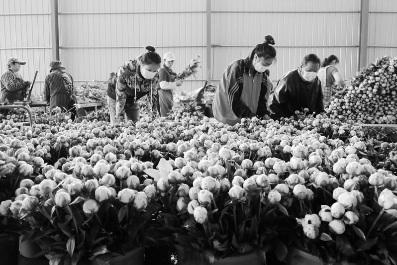 连日来,在位于山东省滨州市博兴县曹王镇西赵冯村芍药种植基地的花田里,花农们加紧采收芍药鲜切花。近年来,山东省滨州市博兴县曹王镇大力发展芍药鲜切花产业,并依托鲜切花产业带动乡村旅游发展,带动乡村振兴。图为5月9日,工人在曹王镇西赵冯村芍药种植基地加工车间内整理修枝后的芍药鲜切花。