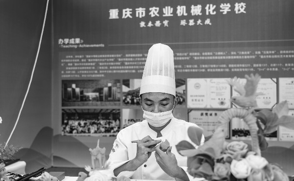 日前,2023年成渝地区双城经济圈职业教育活动周启动仪式在重庆市永川区举行,来自川渝两地近30所职业院校在办学成果展上展示了职业教育改革发展、产教融合等方面的成就。此外,以永川国家高新区为基础,联合西部地区产业园区、企业、学校、科研机构共同组建的西部职教基地产教联合体也于当日在永川正式成立。图为在重庆市永川区举行的2023年成渝地区双城经济圈职业教育活动周办学成果展上,重庆市农业机械化学校学生崔志军在现场展示食品雕花技艺。