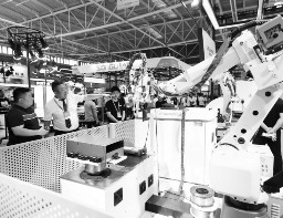 7月18日,参观者在2023青岛国际机床展览会上了解焊接机器人。当日,为期5天的2023青岛国际机床展览会在位于山东省青岛市即墨区的青岛国际博览中心开幕。展会面积达12万平方米,集聚了来自全球的1500余家参展商。展会聚焦数字化转型背景下智能工厂建设、新能源汽车及零配件柔性生产、智能化切削加工、航空航天精密制造等领域,重点展示金属切削、激光钣金、数字化工厂、工业自动化、工装模具等技术和装备。