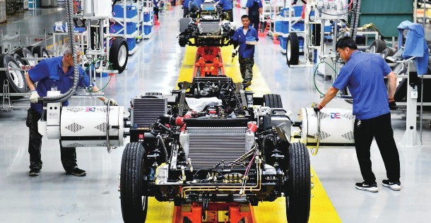 近日,在位于威海市文登区的潍柴新能源商用车有限公司,工人在生产线上装配汽车。山东省威海市文登区近年来深入实施“工业倍增”行动,聚焦汽车机电、新能源新材料、电子信息、医药及健康食品四大主导产业,稳步构建“领军企业+产业集群+特色园区”的现代化产业体系。据悉,文登区高新技术产业产值占比由2021年的56%增长到目前的60%。