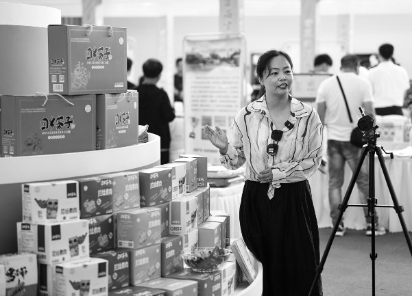 8月12日,一名网络主播在展销会上介绍产品。当日,宁夏预制菜产业发展推进会暨首届宁夏重点预制菜推介展销会在宁夏农旅产业园开幕。本次大会以“宁夏预制菜知遇新期待”为主题,吸引150余家预制菜、农产品、冷链物流企业携即烹肉制品、自热米饭(火锅)、米面制品、酱类制品参展。