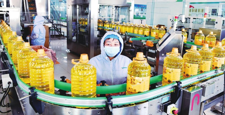 日前,在山东香驰粮油有限公司,工作人员在食用油生产线值守。山东省滨州市博兴县按照“沿链聚合、打造生态”的产业组织理念,加快整体“强链”、高端“补链”、跨界“延链”,“链上发力”赋能县域经济“强筋健骨”。经过多年发展,博兴县已培育形成粮油食品加工、金属板材、商用厨具、石油化工等主导产业。今年前三季度,博兴县实现规上工业总产值1198.26亿元。