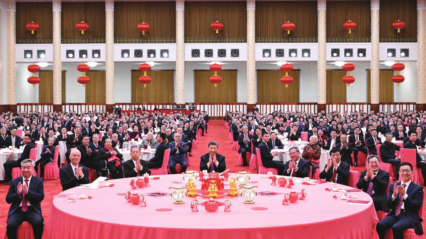 李强主持 赵乐际王沪宁蔡奇丁薛祥李希韩正出席 【新华社北京2月8日电】中共中央、国务院8日上午在人民大会堂举行2024年春节团拜会。中共中央总书记、国家主席、中央军委主席习近平发表讲话,代表党中央和国务院,向全国各族人民,向香港特别行政区同胞、澳门特别行政区同胞、台湾同胞和海外侨胞拜年。 习近平强调,即将过去的癸卯兔年,是全面贯彻党的二十大精神的开局之年。面对异常复杂的国际环境和艰巨繁重的改革发展稳定任务,我们以中国式现代化凝心聚力,统筹国内国际两个大局,顽强拼搏、勇毅前行,战胜多重困难挑战,在全面建设社会主义现代化国家新征程上迈出坚实步伐。 李强主持团拜会,赵乐际、王沪宁、蔡奇、丁薛祥、李希、韩正等出席。 人民大会堂宴会厅灯光璀璨、喜气洋洋,各界人士齐聚一堂、共迎新春,现场洋溢着欢乐祥和的节日气氛。 上午10时许,在欢快的乐曲声中,习近平等党和国家领导人步入大厅,向大家挥手致意,同大家互致问候、祝福新春,全场响起热烈掌声。 习近平在讲话中指出,一年来,我们全面贯彻新发展理念,坚持稳中求进工作总基调,果断实行新冠疫情防控转段,推动经济恢复发展,经济总量超过126万亿元,粮食总产再创新高,就业、物价总体平稳,放眼全球仍然是"风景这边独好"。科技创新实现新突破,新质生产力加快形成。改革开放不断深化,新一轮党和国家机构改革基本完成。生态环境持续改善。国防和军队现代化迈出新的步伐。成功举办成都大运会、杭州亚运会,我国体育健儿创造良好成绩。纵深推进全面从严治党和反腐败斗争,不断巩固良好政治生态。我们坚持人民至上,着力保障和改善民生,持续巩固拓展脱贫攻坚成果,用心用情解决人民群众急难愁盼问题,全力以赴应对自然灾害和推动灾后恢复建设,社会大局保持稳定。我们积极支持香港、澳门更好融入国家发展大局,坚决反对"台独"分裂行径和外部势力干涉,有力捍卫国家主权、安全、发展利益。扎实推进中国特色大国外交,为变乱交织的世界增添确定性和正能量,展现了推动构建人类命运共同体的责任担当。 习近平强调,回顾一年来的拼搏奋斗,我们更加深切地体会到,以中国式现代化全面推进强国建设、民族复兴伟业,既是中国人民追求美好幸福生活的光明之路,也是促进世界和平和发展的正义之路。只要我们坚持道不变、志不改,一以贯之、勠力同心,就一定能够战胜前进中的各种艰难险阻,不断迈向成功的彼岸。 习近平指出,2024年是新中国成立75周年,是实现"十四五"规划目标任务的关键一年。我们要坚持稳中求进工作总基调,贯彻稳中求进、以进促稳、先立后破的要求,完整、准确、全面贯彻新发展理念,统筹高质量发展和高水平安全,突出重点、把握关键,锐意进取、真抓实干,切实增强经济活力、防范化解风险、改善社会预期,巩固和增强经济回升向好态势,持续增进民生福祉,保持社会大局和谐稳定。 习近平强调,要进一步全面深化改革,着力破解深层次体制机制障碍和结构性矛盾,充分激发全社会创业创新创造活力,为推进中国式现代化注入强大动力,使中国式现代化建设披荆斩棘、一往无前。 习近平指出,龙是中华民族的图腾,具有刚健威武的雄姿、勇猛无畏的气概、福泽四海的情怀、强大无比的力量,既象征着五千年来中华民族自强不息、奋斗进取的精神血脉,更承载着新时代新征程亿万中华儿女推进强国建设、民族复兴伟业的坚定意志和美好愿望。甲辰龙年,希望全国人民振奋龙马精神,以龙腾虎跃、鱼跃龙门的干劲闯劲,开拓创新、拼搏奉献,共同书写中国式现代化建设新篇章。(讲话全文另发) 团拜会上,文艺工作者表演了精彩的节目。 中共中央、全国人大常委会、国务院、最高人民法院、最高人民检察院、全国政协、中央军委领导同志和老同志出席团拜会。 参加团拜会的还有中央党政军群各部门及北京市负责同志,各民主党派中央、全国工商联负责人和无党派人士代表,离退休老同志代表,著名专家学者及首都各界人士代表。 (图1)2月8日,中共中央、国务院在北京人民大会堂举行2024年春节团拜会。中共中央总书记、国家主席、中央军委主席习近平发表讲话。新华社记者鞠鹏/摄 (图2)2月8日,中共中央、国务院在北京人民大会堂举行2024年春节团拜会。党和国家领导人习近平、李强、赵乐际、王沪宁、蔡奇、丁薛祥、李希、韩正等同首都各界人士齐聚一堂、共迎新春。新华社记者申宏/摄