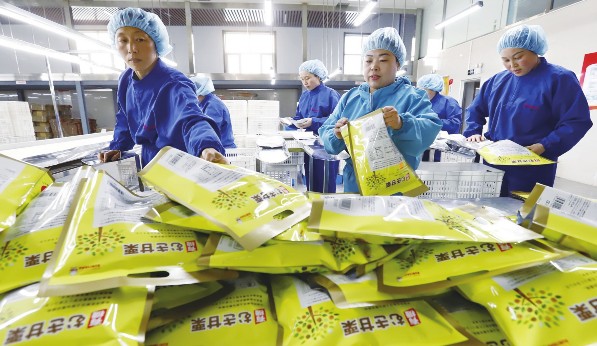 近年来,地处燕山脚下的河北省遵化市依托当地板栗、鲜桃、核桃、山楂等果树资源丰富的特点,大力发展农产品深加工产业,引导扶持食品龙头企业制作加工栗仁、核桃仁、水果罐头等食品,助推山区绿色经济发展,助力乡村振兴。图为工人在河北省遵化市一家板栗深加工企业的生产车间工作。