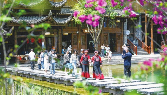 4月5日,游客在贵州省黔西南布依族苗族自治州兴义市峰林布依景区游玩。当日正值清明节假期,人们纷纷走出家门,踏青游玩,乐享美好春光。
