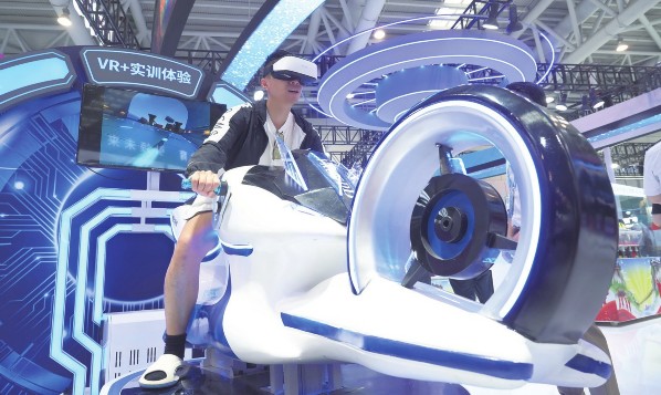 5月23日,观众在现场体验光速飞轮VR摩托竞速大型体感游戏机。当日,第七届数字中国建设峰会现场体验区在福州海峡国际会展中心向专业观众开放。第七届数字中国建设峰会将于5月24日至25日在福建省福州市举办。
