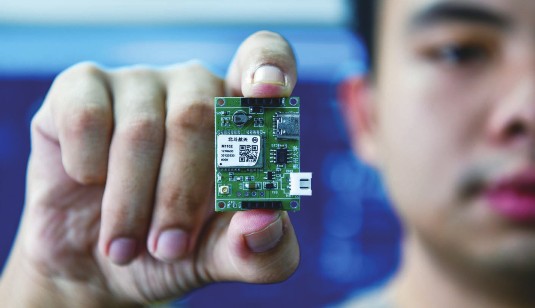八月二十九日,学生在贵州大学省部共建公共大数据国家重点实验室展示一款高精度北斗定位芯片。贵州大学省部共建公共大数据国家重点实验室于二○二一年