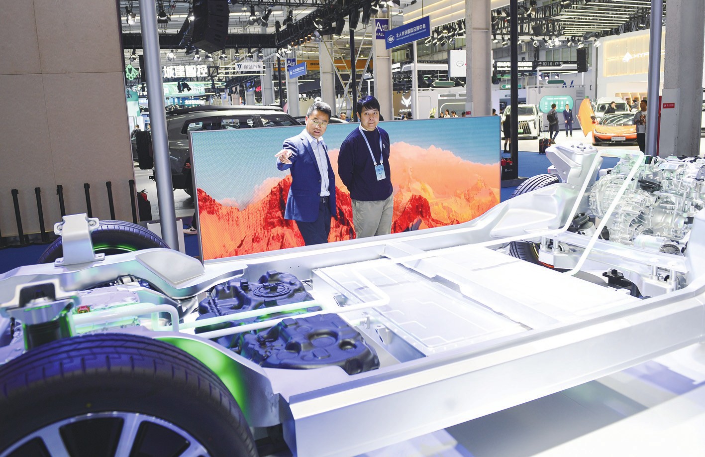 10月17日,参会者在问界汽车展台了解其“赛力斯魔方平台”相关技术特点。