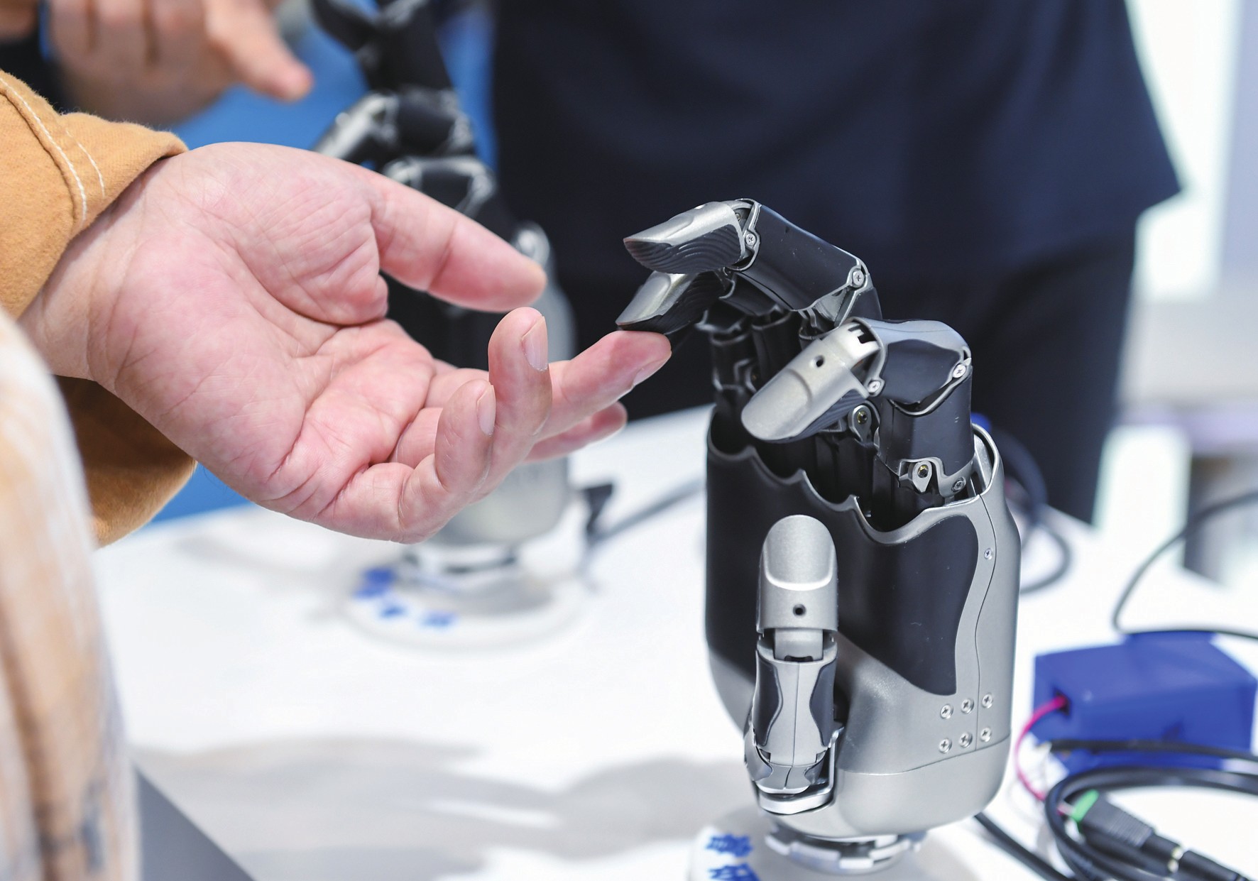 粤港澳大湾区研发能力突出、工业制造基础雄厚,为人形机器人产业发展提供了沃土。近年来,从基础零部件到整体系统的智能集成,人形机器人产业的多个赛道正在大湾区蓬勃发展,众多科技企业和科研院校聚集于此,形成强大的创新合力,推动人形机器人向更智能、更灵活的方向迈进,并逐步应用于工业生产、医疗护理、教育科研等多个领域,为我国新质生产力发展注入令人瞩目的“灵动”力量。图为观众体验深圳睿研智能控制有限公司展示的一款灵巧手。新华社记者毛思倩/摄