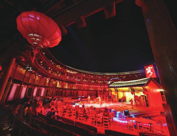 随着春节的临近,福建省龙岩市永定区的土楼迎来众多游客。“福建土楼”不仅承载着客家人团圆的记忆,还吸引着无数外地游客前来探访。“福建土楼”于2008年被列入《世界遗产名录》。图为1月19日,游客在福建省龙岩市永定区的土楼观看演出。