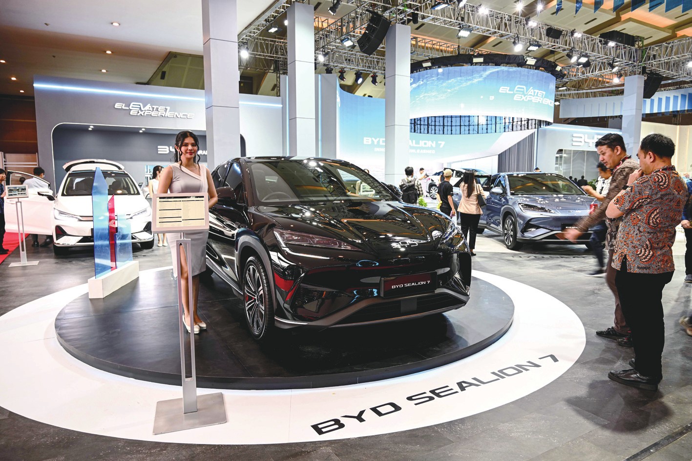这是2月13日在印度尼西亚雅加达的印尼国际车展现场拍摄的中国汽车品牌比亚迪展台。2025年印度尼西亚国际车展当日在雅加达开幕,众多中国汽车品牌亮相。