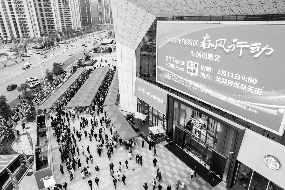 这是2月11日在望城区龙湖月亮岛天街商场外坪拍摄的招聘会现场(无人机照片)。