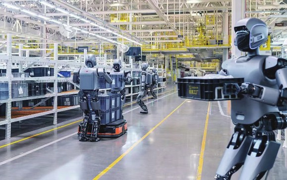 近日,优必选在极氪5G智慧工厂开展全球首例多台、多场景、多任务的人形机器人协同实训,探索建立面向多任务工业场景的通用人形机器人群体作业解决方案,推动人形机器人从单机自主向群体智能进化。图为数十台优必选工业人形机器人Walker S1协同搬运大负载大尺寸料箱。优必选供图