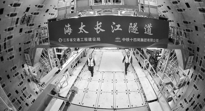4月9日拍摄的“江海号”盾构机内部。当日,在长江入海口的江苏南通海门,我国自主研制、最大开挖直径达16.64米的“江海号”盾构机缓缓启动,新“万里长江第一隧”、我国最长公路水下盾构隧道海太长江隧道正式开掘。海太长江隧道北起南通海门区,南至苏州太仓市。线路全长39.07公里,包含过江隧道长11.185公里,采用双向六车道高速公路设计标准,设计时速100公里。其中中铁十四局承建的盾构隧道段长9315米。新华社记者季春鹏/摄
