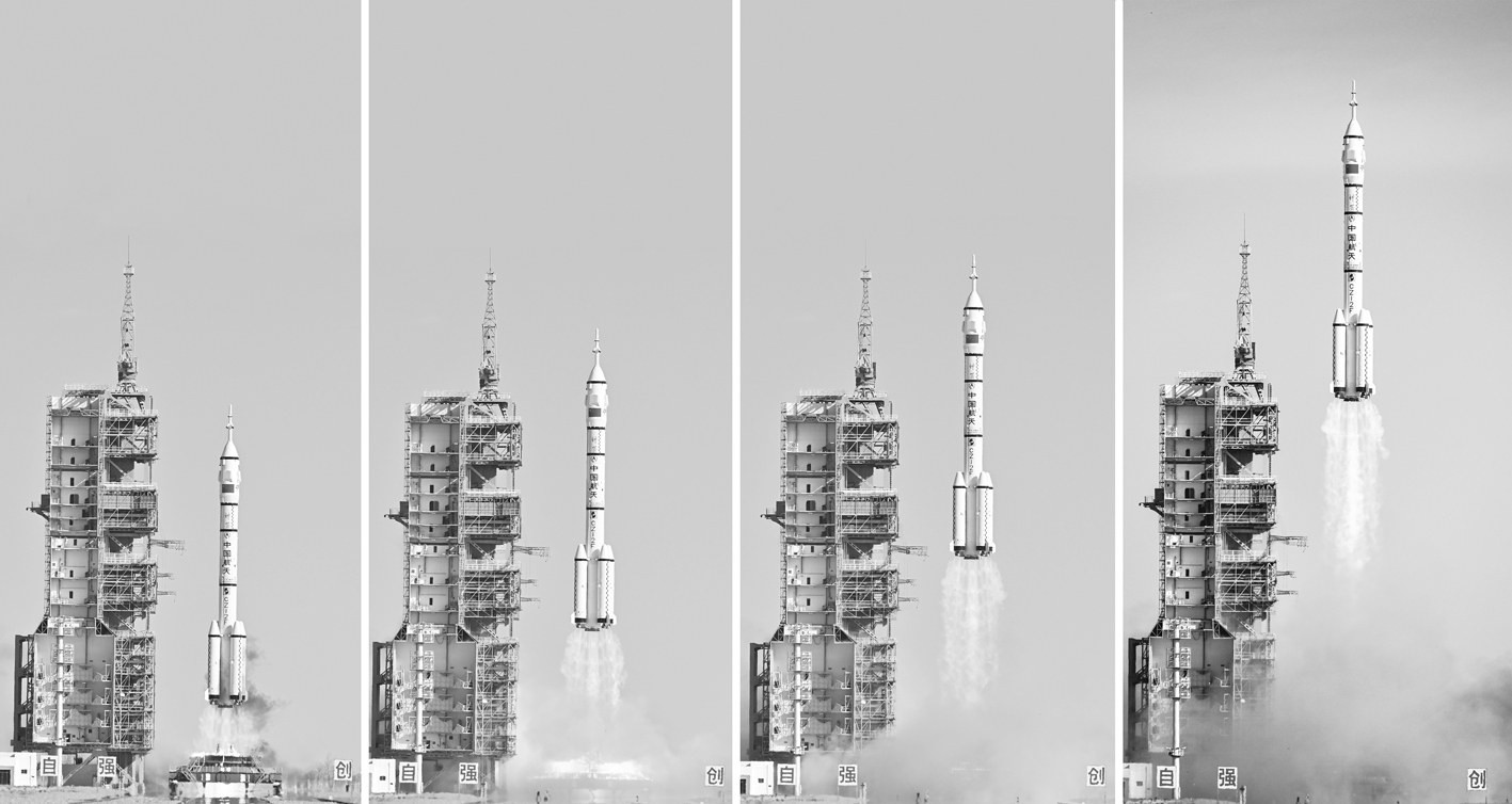 4月24日,搭载神舟二十号载人飞船的长征二号F遥二十运载火箭在酒泉卫星发射中心发射(拼版照片)。飞船与火箭成功分离,进入预定轨道。目前,航天员乘组状态良好,发射取得圆满成功。新华社记者连振李鑫/摄