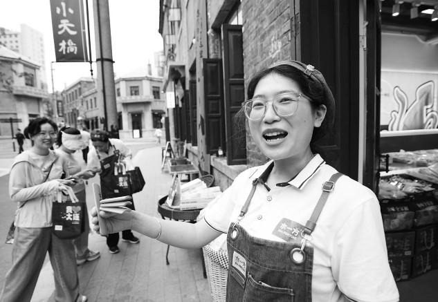 在大连东关街历史文化街区,一名售货员以快板的方式推销美食商品。作为全国零售业创新提升试点城市,辽宁大连以“一店一策”模式推动商业焕新:全国知名商业街天津街引入京东MALL项目、老旧的东关街改造升级为历史文化街区等,依托这些重点项目,带动区域经济发展、产业结构优化和就业增长,为商业繁荣注入新活力。新华社记者李钢/摄