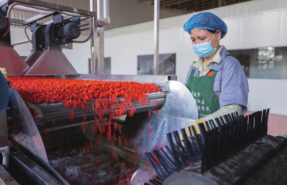 近年来,宁夏吴忠市同心县河西镇依托当地三条引黄干渠灌溉网络,流转土地发展枸杞种植,通过龙头企业带动的方式发展枸杞深加工,除了传统干果枸杞之外,研发出枸杞原浆、枸杞果酱、枸杞粉等产品,深受国内外消费者喜爱。目前,同心县河西镇枸杞种植面积约1.1万亩,枸杞产业年产值超2.7亿元。图为在宁夏同心县河西镇一家枸杞企业,工作人员在清洗枸杞。新华社记者杨植森/摄