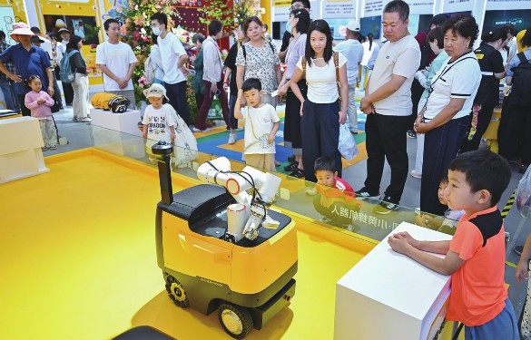 9月14日,观众在服贸会美团展台观看配送机器人。9月14日,2025年中国国际服务贸易交易会在北京落下帷幕。新华社记者李鑫/摄
