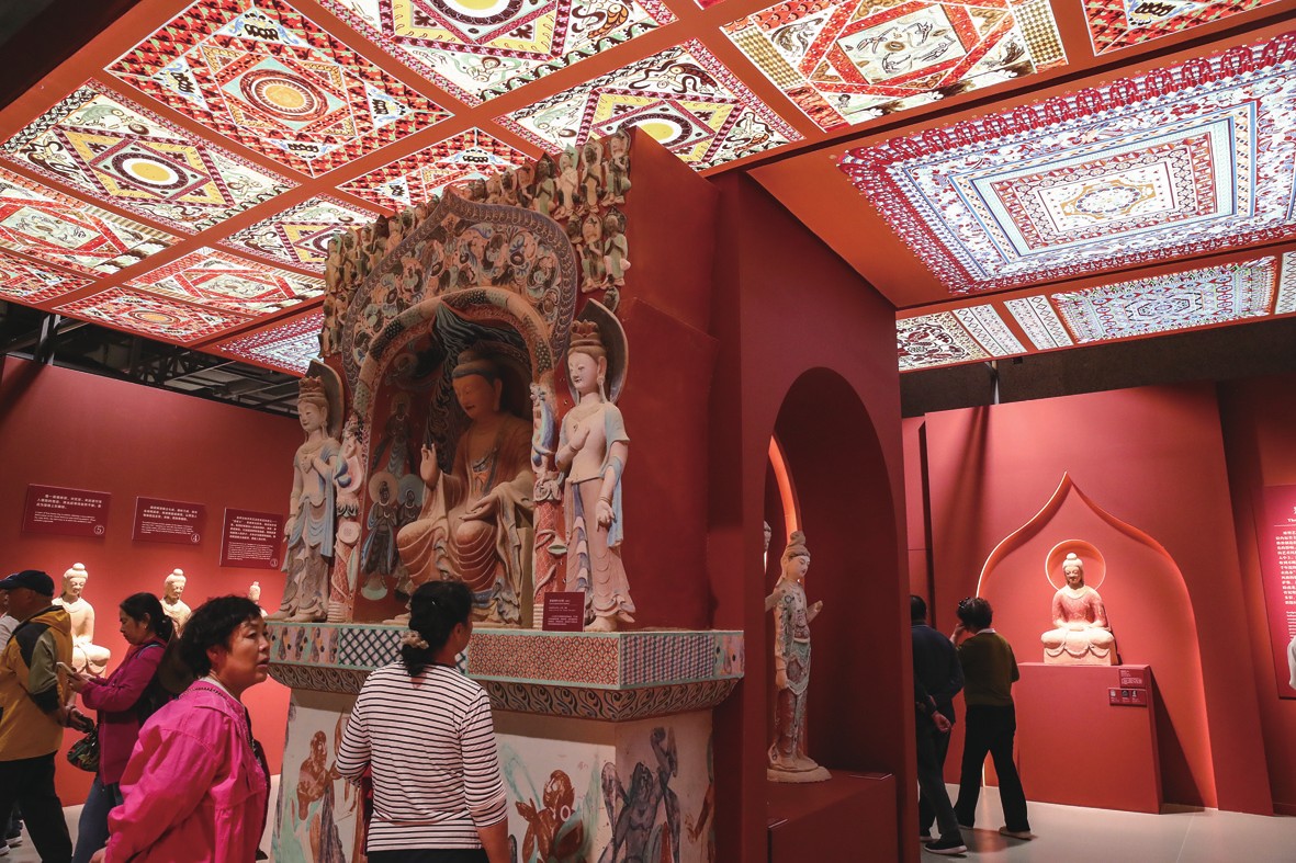 9月20日至22日,第八届丝绸之路(敦煌)国际文化博览会在甘肃省敦煌市举行。敦煌研究院“典范”“高地”建设成果展、甘肃文旅非遗文创展、敦煌·丝路雕塑展等多项展览同步亮相,集中展现了敦煌文化遗产保护、研究、弘扬的最新成果以及共建“一带一路”国家的文化艺术、非遗文创、风土人情等精彩内容。图为9月22日,游客参观敦煌文博会上的展览。新华社记者郎兵兵/摄