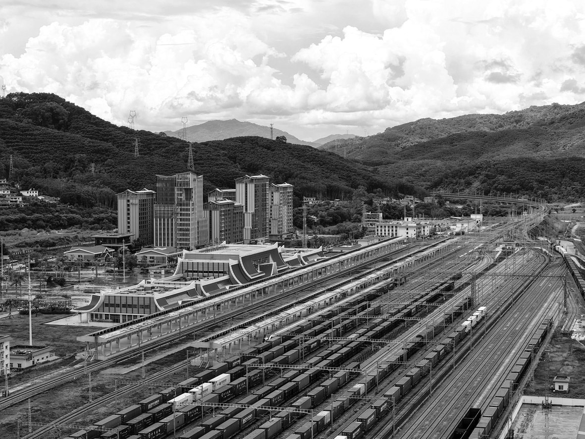 9月21日,中老铁路上的货运列车在磨憨站通过(无人机照片)。