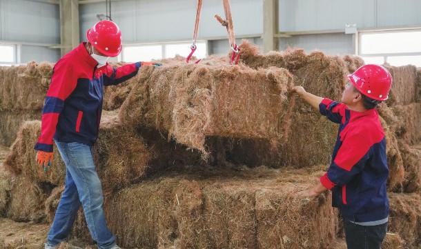 日前,在新疆尉犁一家服装公司的罗布麻纤维脱胶车间,工人吊送原材料。 新疆巴音郭楞蒙古自治州尉犁县位于塔克拉玛干沙漠边缘,当地通过发展罗布麻产业,“管寸草不生的沙漠要土地”,实现人进沙退、增收致富,探索出一条生态保护与经济发展协同并进的新路。 罗布麻具有耐旱、耐盐碱、耐寒暑、抗风沙、生态适应能力强等特点。当地规划罗布麻治沙技术区,采用种植罗布麻生物固沙和铺设草方格工程治沙的模式,减缓沙漠流动速度,阻隔沙漠对绿洲的侵袭。同时,当地建设罗布麻产业园,推动罗布麻在纺织、保健品等产业应用,带动当地1000余人就业增收。新华社发汪志鹏/摄