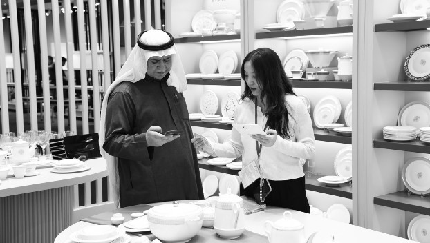 10月27日,采购商在第138届广交会第二期展会上查看瓷器餐具产品。第138届广交会第二期10月27日闭幕,为期5天的展会以“品质家居”为主题,集中展示家庭用品、礼品及装饰品、建材及家具3大板块。本届广交会第二期线下展览总面积达51.5万平方米,展位数2.5万个,参展企业超1万家。新华社记者洪泽华/摄