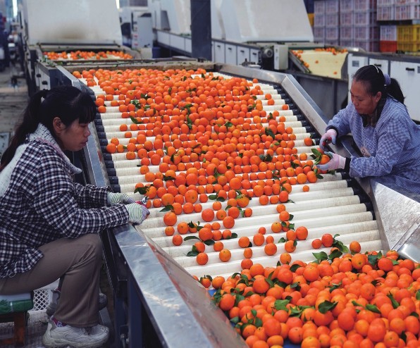 近年来,云南省华宁县因地制宜发展柑橘产业,建设柑橘产业园,推动产业绿色化、规模化、品牌化发展。产业园采取“公司+集体经济组织(专业合作社)+农户”的发展模式,带动农户增收。图为在云南省华宁县华溪镇柑橘收购工厂,选果工人在分拣柑橘。新华社发梁志强/摄