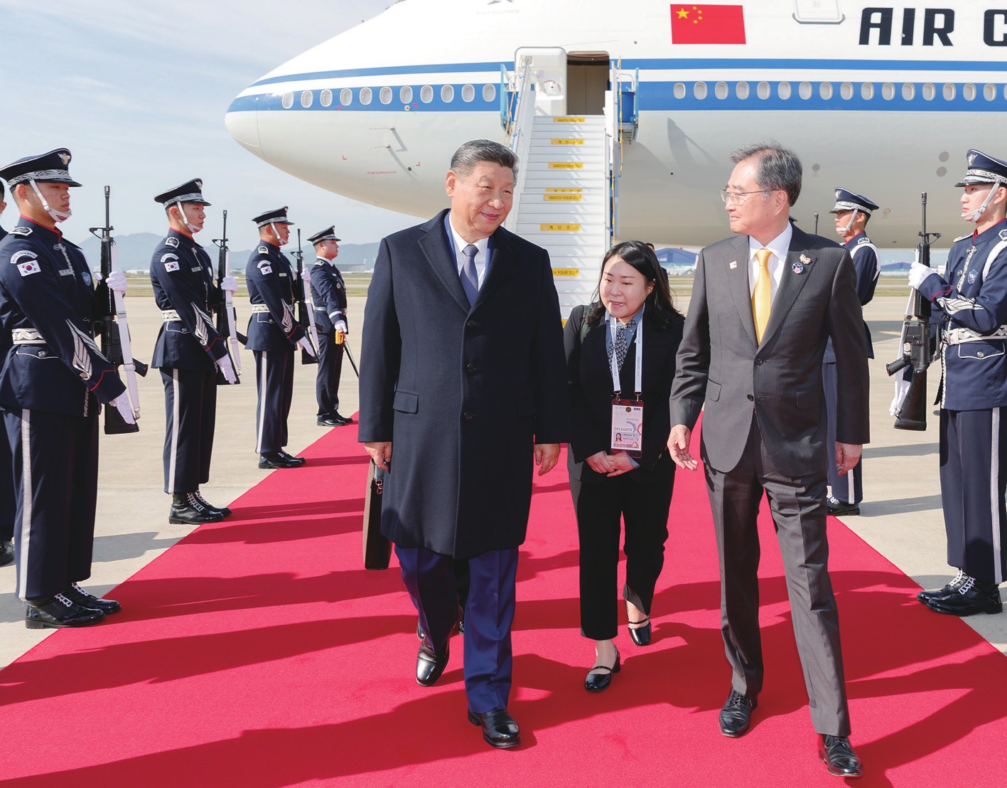 【新华社韩国釜山10月30日电】当地时间10月30日上午,国家主席习近平乘专机抵达韩国,应大韩民国总统李在明邀请,出席亚太经合组织第三十二次领导人非正式会议并对韩国进行国事访问。 习近平抵达釜山金海国际机场时,韩国外长赵显等高级官员热情迎接。礼兵分列红地毯两侧致敬,军乐团演奏行进乐,机场鸣放21响礼炮。 蔡奇、王毅、何立峰等陪同人员同机抵达。 先期抵达的香港特别行政区行政长官李家超、中国驻韩国大使戴兵也到机场迎接。 中国留学生和中资企业代表挥舞中韩两国国旗,热烈欢迎习近平到访。(马峥 刘天) (图)当地时间十月三十日上午,国家主席习近平乘专机抵达韩国,应大韩民国总统李在明邀请,出席亚太经合组织第三十二次领导人非正式会议并对韩国进行国事访问。这是习近平抵达釜山金海国际机场时,韩国外长赵显等高级官员热情迎接。新华社记者黄敬文/摄