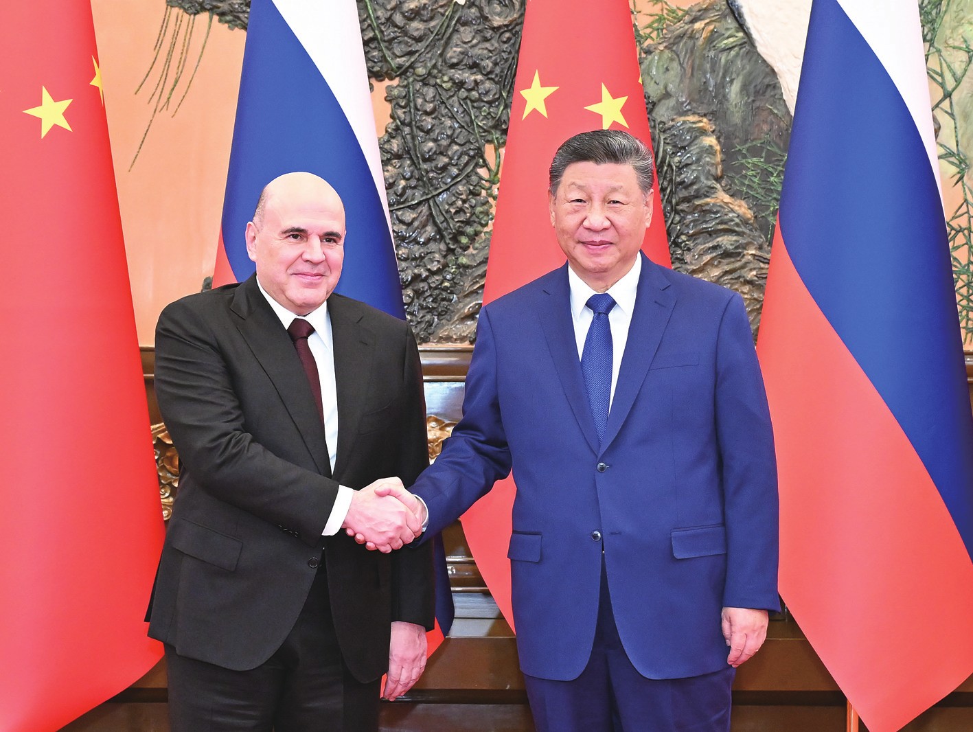 【新华社北京11月4日电】11月4日上午,国家主席习近平在北京人民大会堂会见俄罗斯总理米舒斯京。 习近平指出,今年以来,中俄关系锚定更高水平、更高质量发展目标,在风高浪急的外部环境中笃定前行。维护好、巩固好、发展好中俄关系,是双方的战略抉择。我同普京总统在莫斯科和北京两次会晤,就中俄关系中的战略性、全局性问题深入交流,作出新的谋划和部署。双方要保持密切协调,落实好我同普京总统达成的重要共识,着眼两国和两国人民的根本利益,把中俄合作的蛋糕做好,也为世界和平与发展作出新的更大贡献。 习近平强调,双方要稳步扩大相互投资,开展好能源、互联互通、农业、航空航天等传统领域合作;挖掘人工智能、数字经济、绿色发展等新业态合作潜力,打造新的合作增长点;密切人文交流,让两国社会各界更多人士参与到中俄友好合作的事业中来。前不久,中共二十届四中全会审议通过“十五五”规划建议,对中国未来5年经济社会发展作出顶层设计和战略擘画。中国将全面推进中国式现代化,坚定不移推动经济社会高质量发展,扩大高水平对外开放。中方愿同俄方一道,推动中国“十五五”规划同俄罗斯经济社会发展战略更好对接,不断造福两国人民。 米舒斯京转达普京总统对习近平主席的亲切问候和良好祝愿。米舒斯京表示,祝贺中共二十届四中全会成功举行,相信中国一定会顺利实现“十五五”规划建议确定的目标,取得更大经济社会发展成就。两国元首今年两次会晤,对俄中关系发展作出战略规划,巩固了俄中全面战略协作伙伴关系。俄方愿同中方一道,落实两国元首达成的重要共识,深化经贸、科技、能源、农业、数字经济等领域合作,密切人文交流,加强多边协调配合,推动两国合作取得更多成果。 王毅参加会见。(孙奕) (图)11月4日上午,国家主席习近平在北京人民大会堂会见俄罗斯总理米舒斯京。新华社记者李响/摄