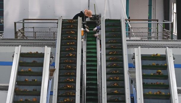 日前,在海南省白沙黎族自治县邦溪镇的闻儒生物科技(海南)有限公司,工人在车间内处理油茶果。